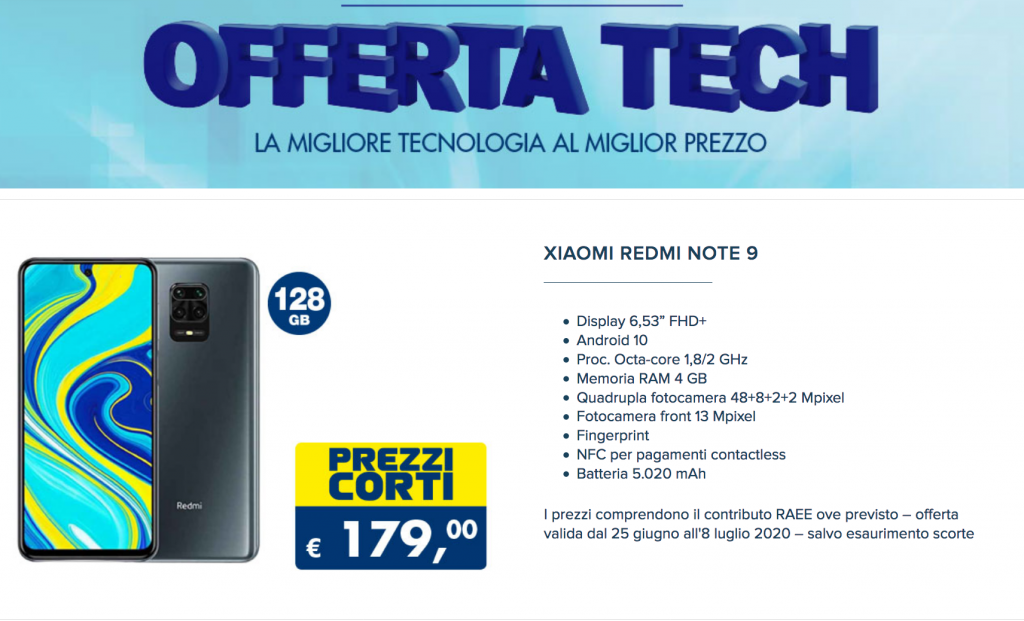 L’offerta tech è dedicata a un dispositivo di grande successo commerciale, lo Xiaomi Redmi Note 9, che viene messo in vendita a 179,90 euro nella sua versione con memoria di archiviazione di 128 GB.