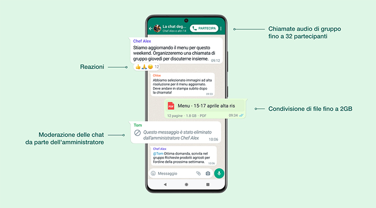 - Moderazione delle chat: gli amministratori del gruppo potranno rimuovere messaggi inappropriati o problematici da tutte le chat.