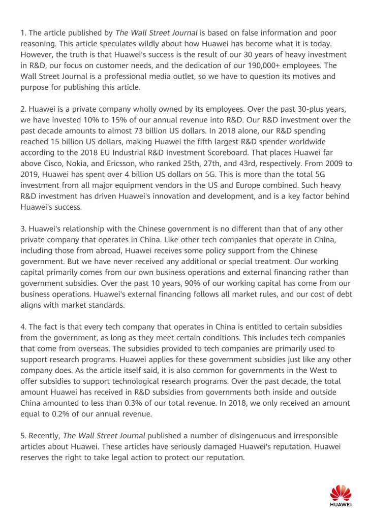 Nella sua dichiarazione, Huawei ha anche affermato che i suoi rapporti con il governo cinese non sono diversi da quelli di qualsiasi altra società privata che opera in Cina nel settore hi-tech e che soddisfa certe condizioni specifiche.